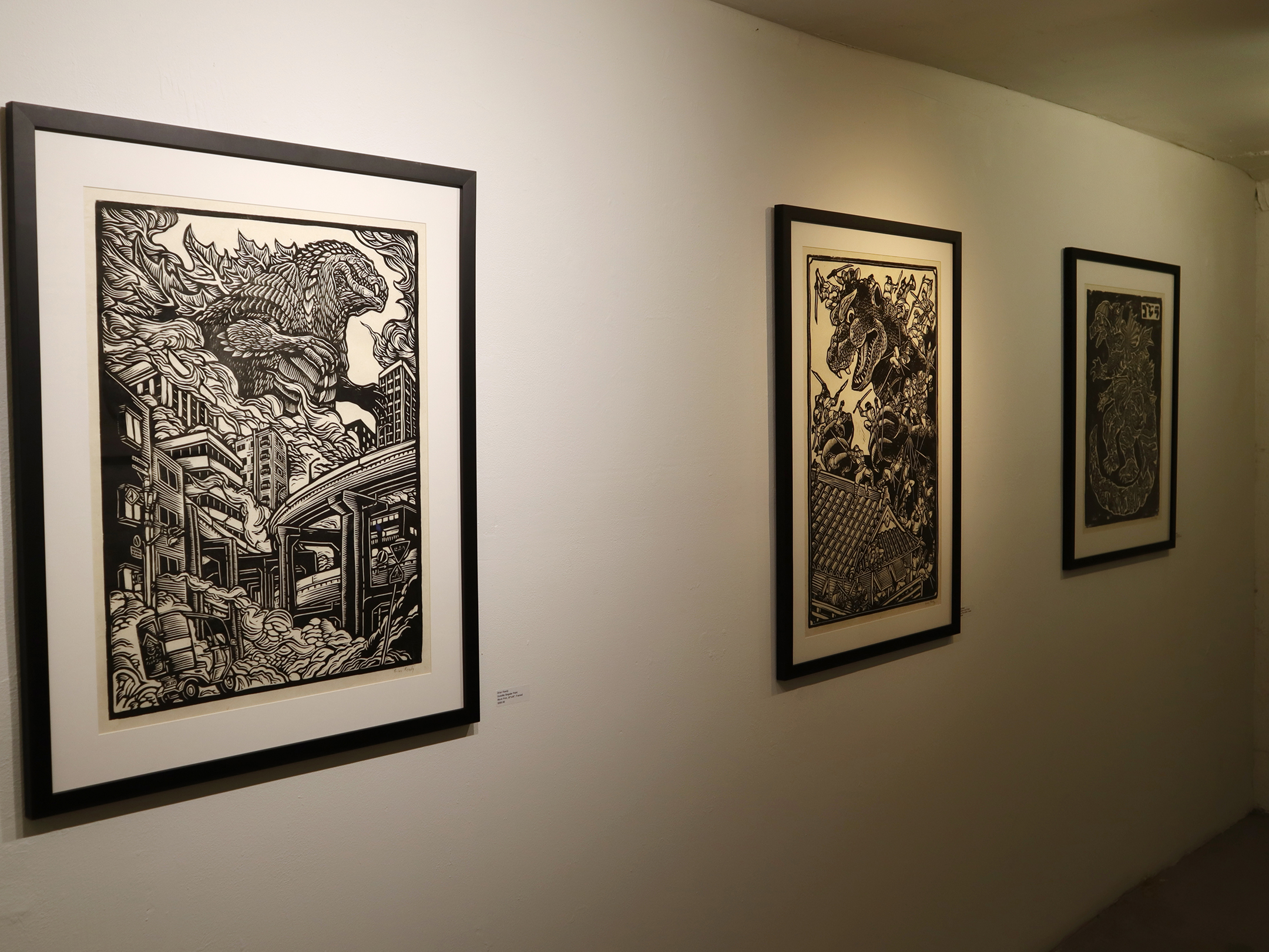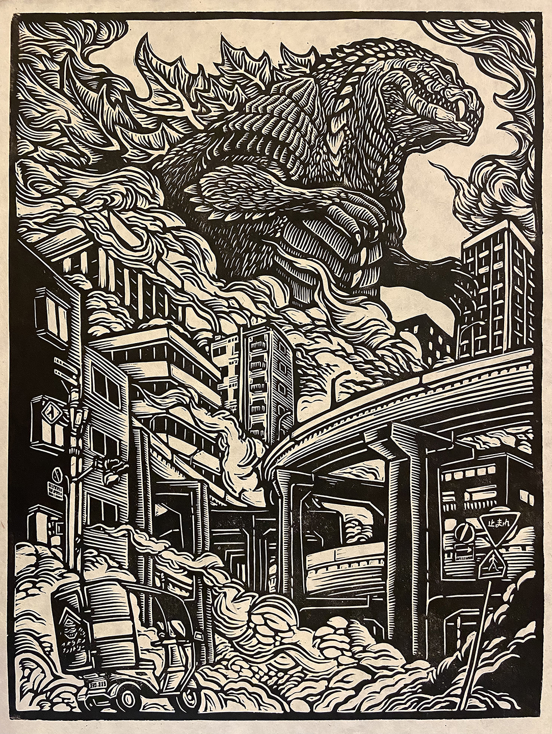 🔴 SOLD "Godzilla Singular Point" Original Linocut Print by Brian Reedy