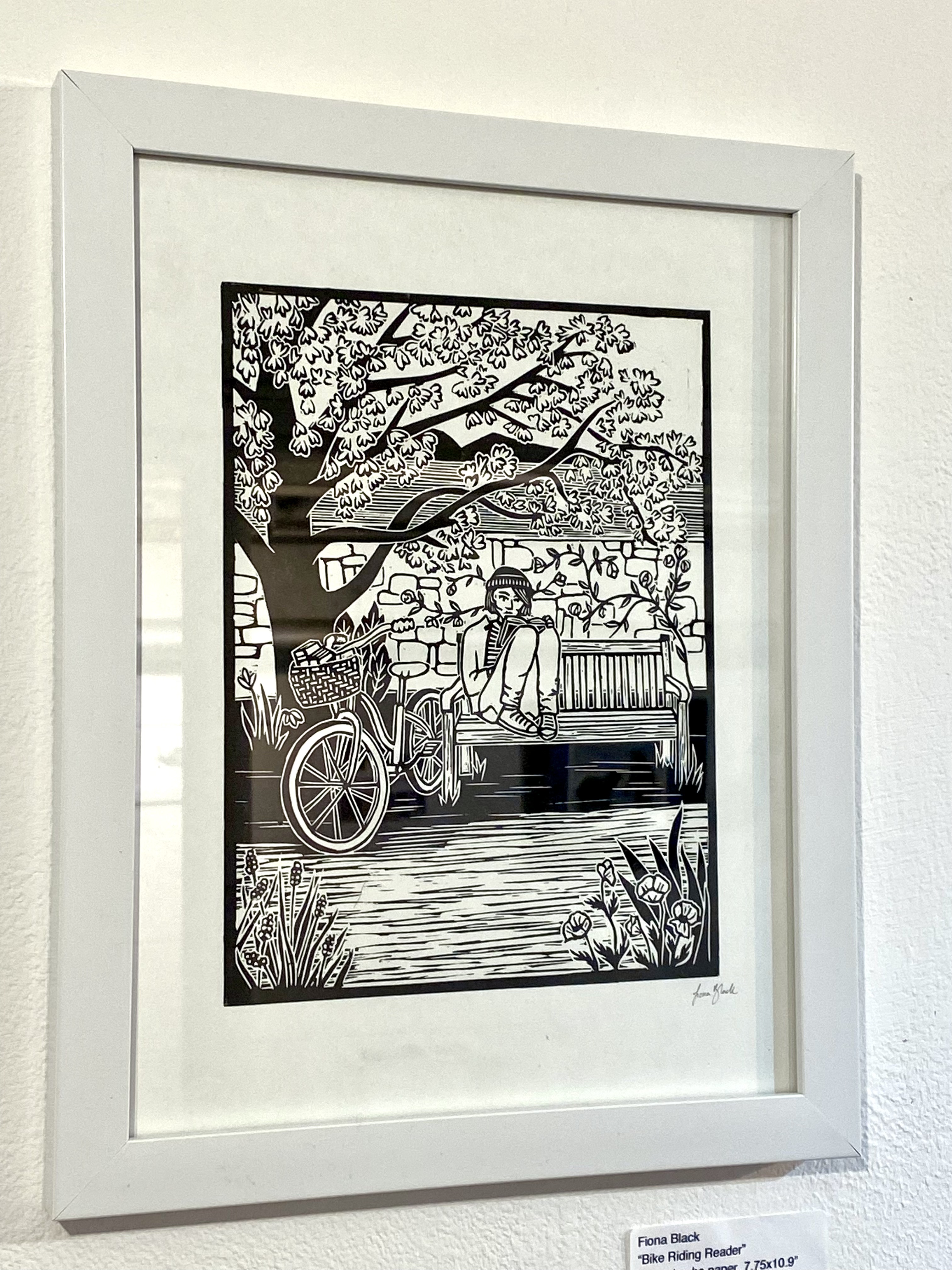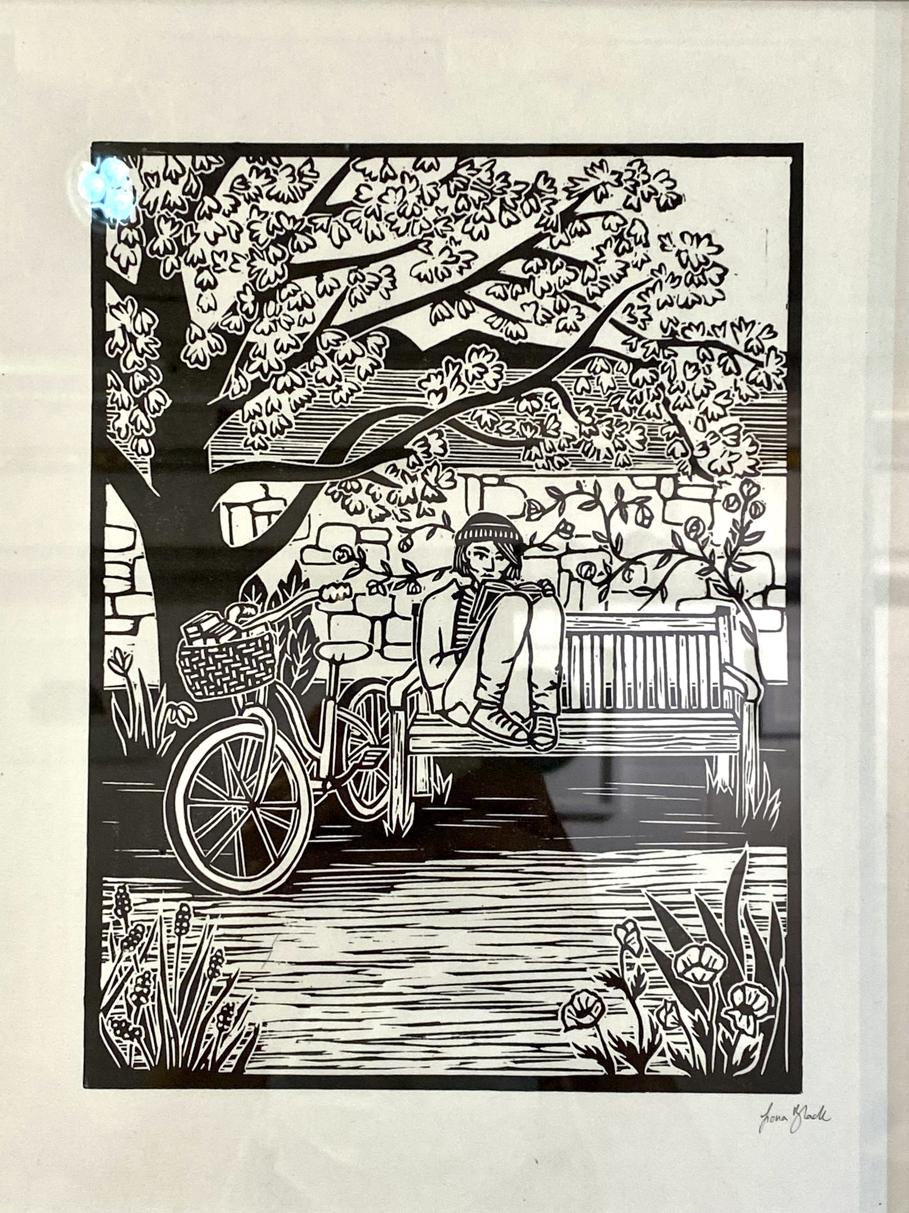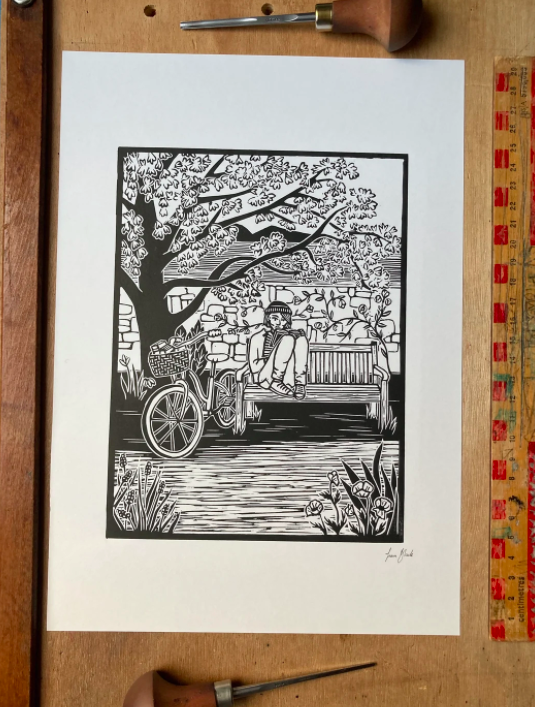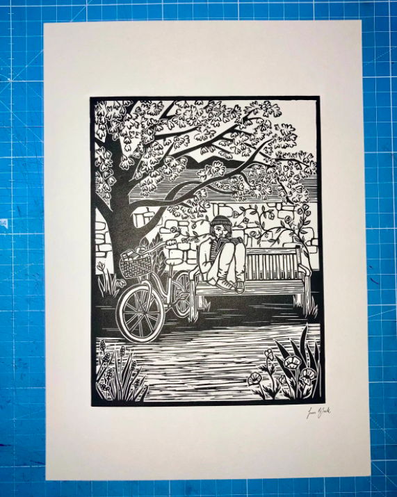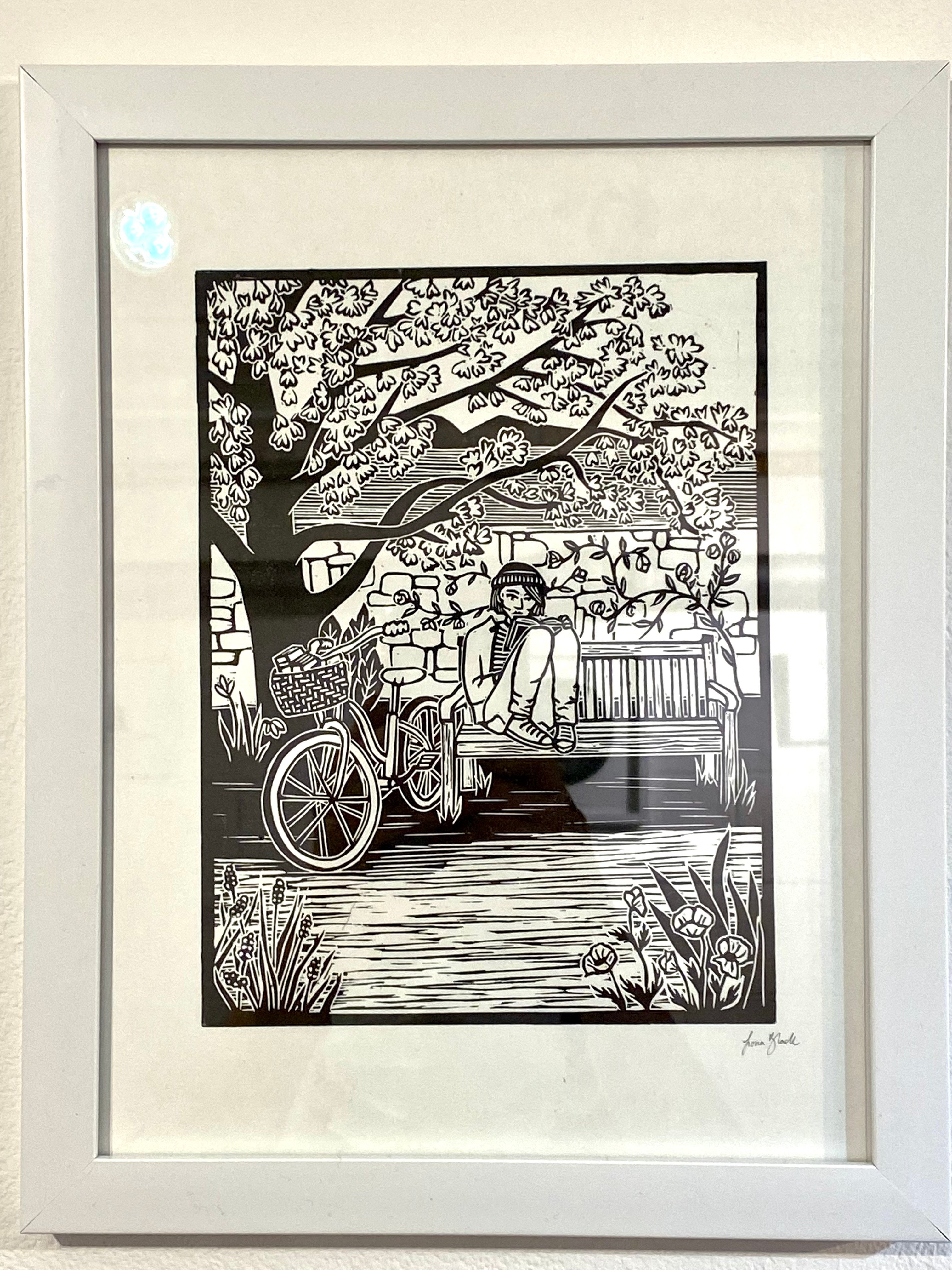 "Bike Riding Book Reader" Original Linocut Print by Fiona Black