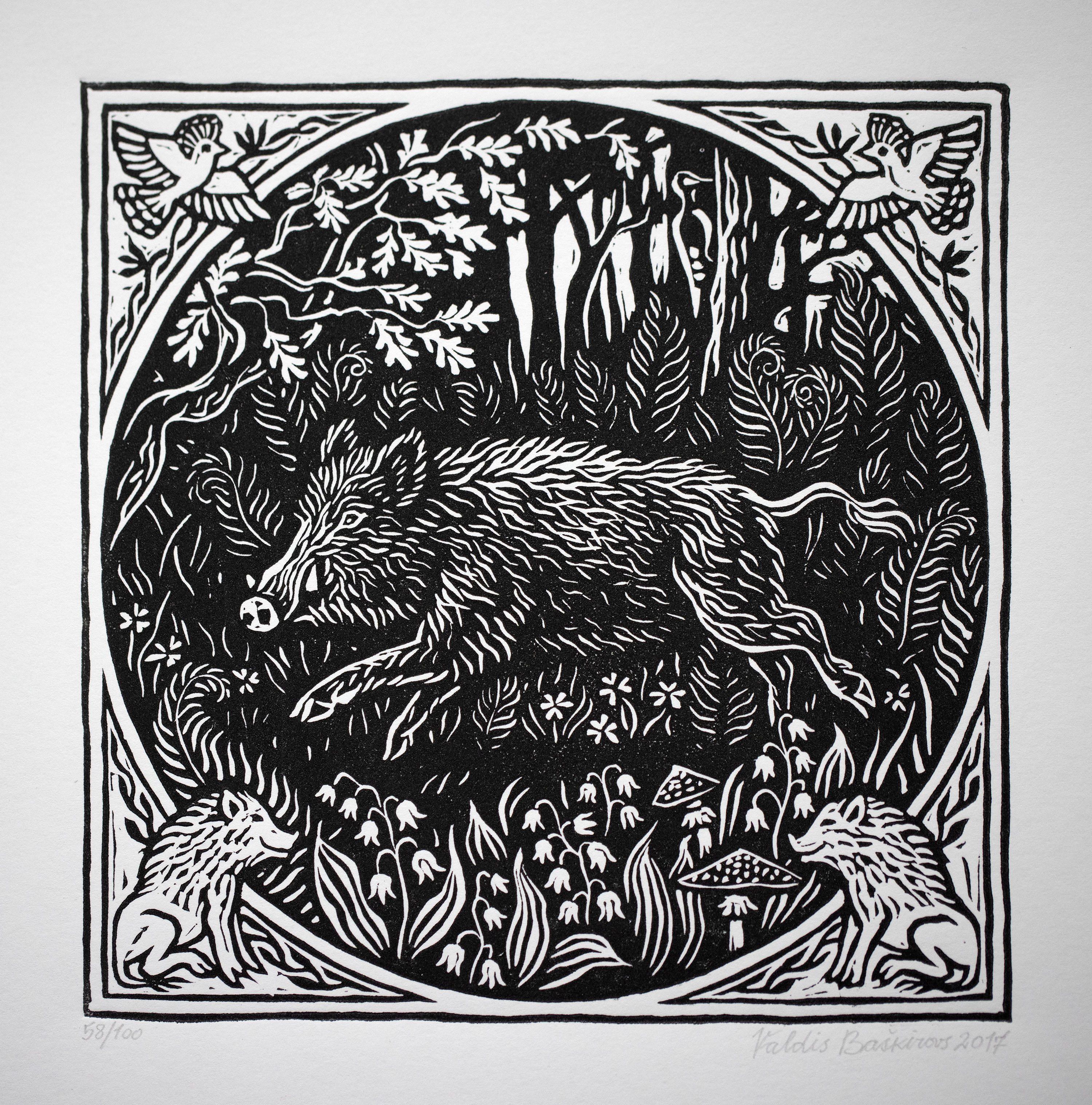 🔴 SOLD "Boar" 2017 Original Linocut Print by Valdis Baškirovs