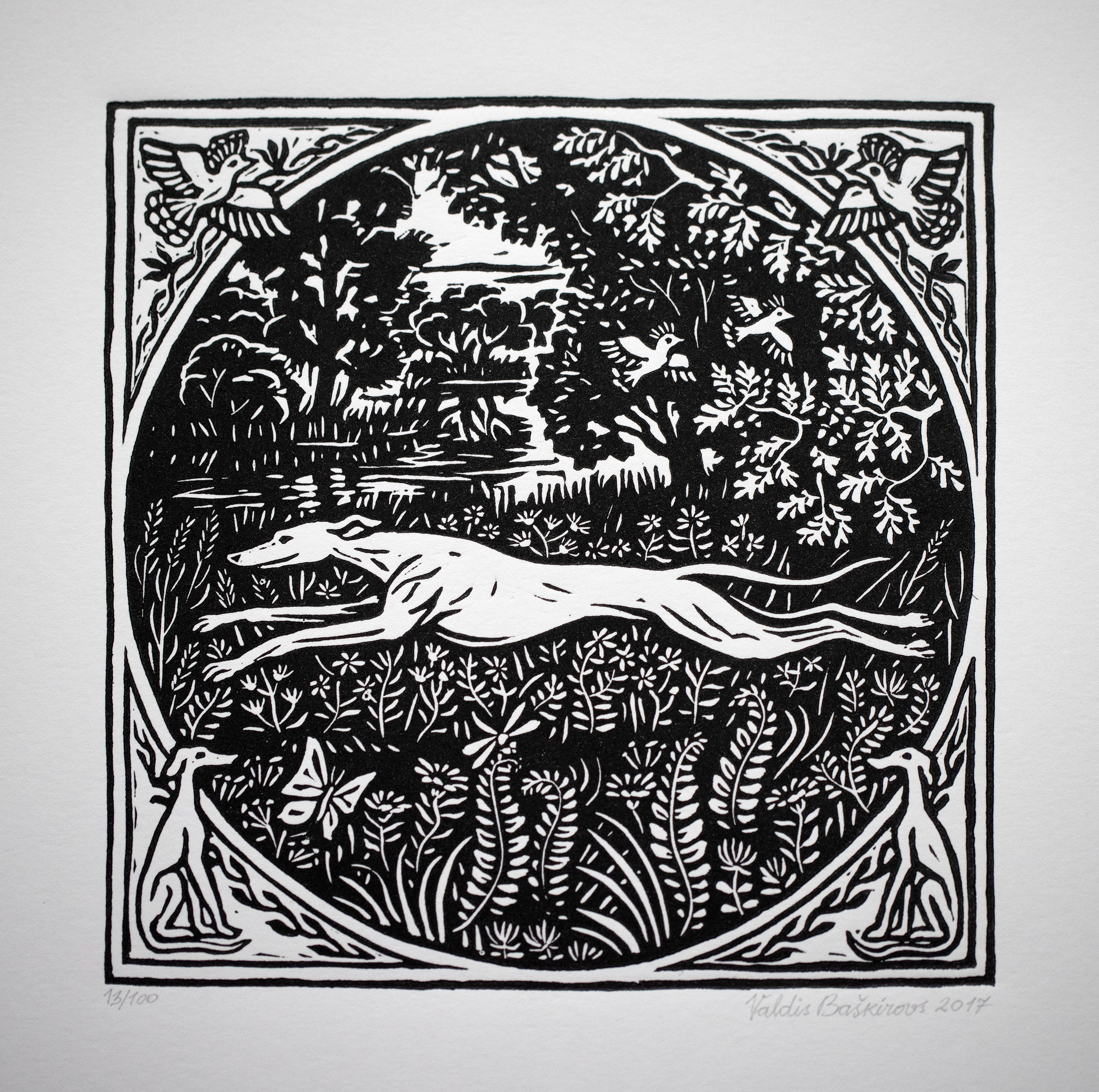 🔴 SOLD "Grey Hound" 2017 Original Linocut Print by Valdis Baškirovs