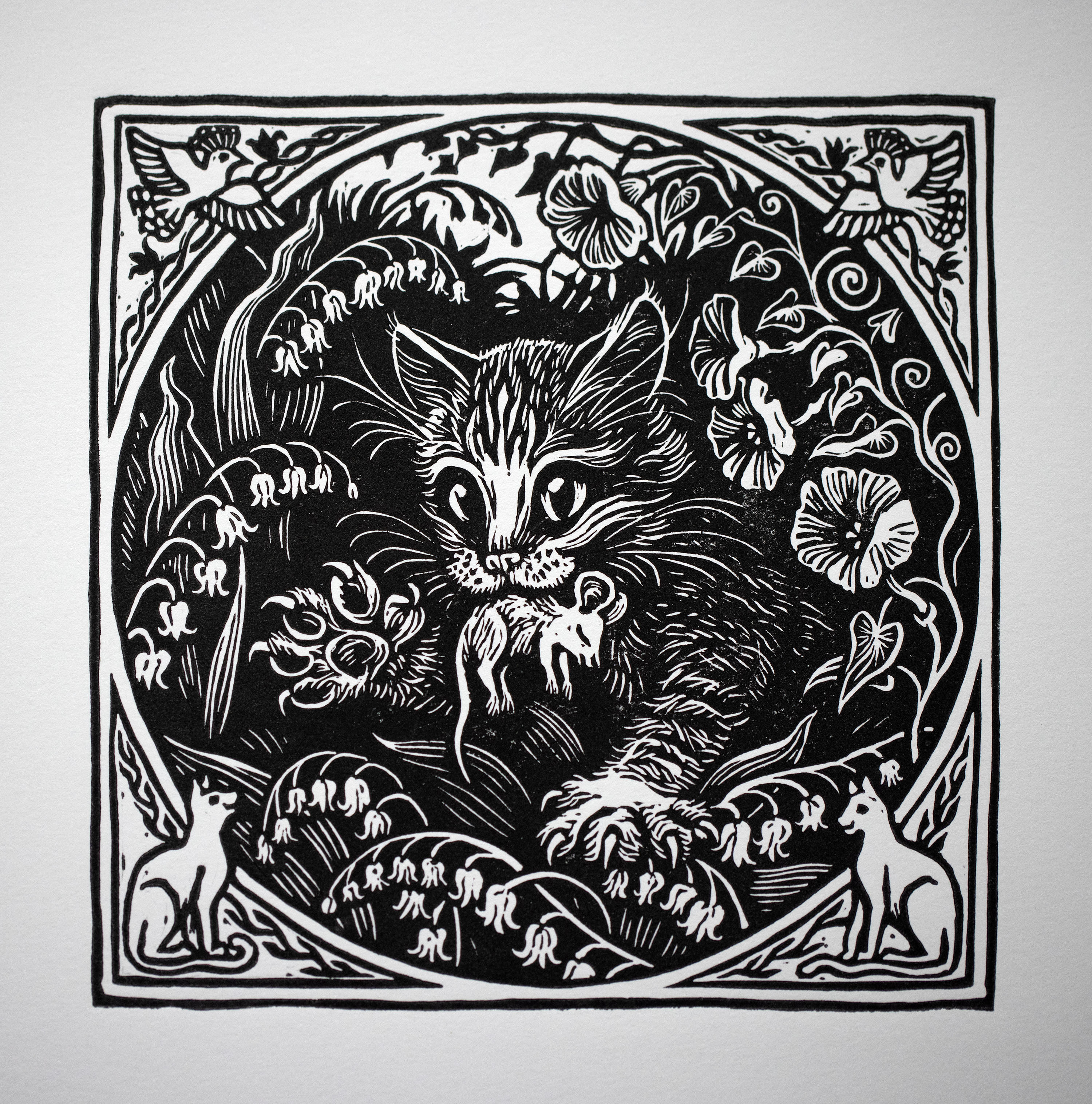 🔴 SOLD "Kitty" 2018" Original Linocut Print by Valdis Baškirovs