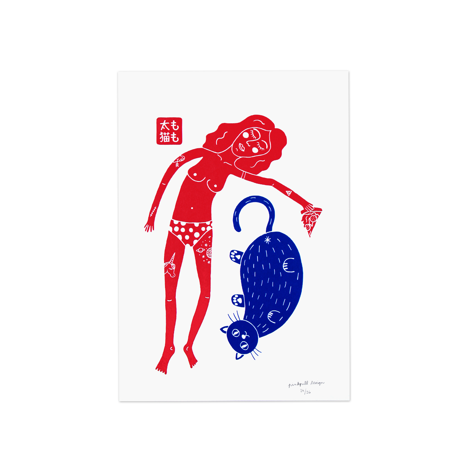 🔴 SOLD "GIRL AND CAT, PIZZA (16/26)" Silkscreen Print by Pinkpill Design