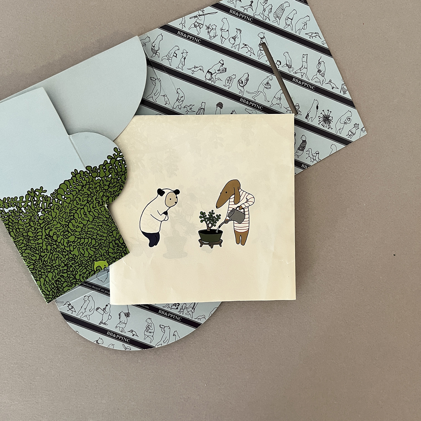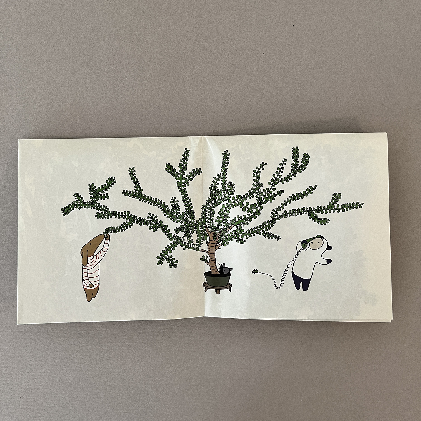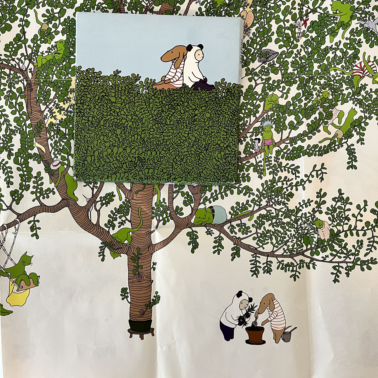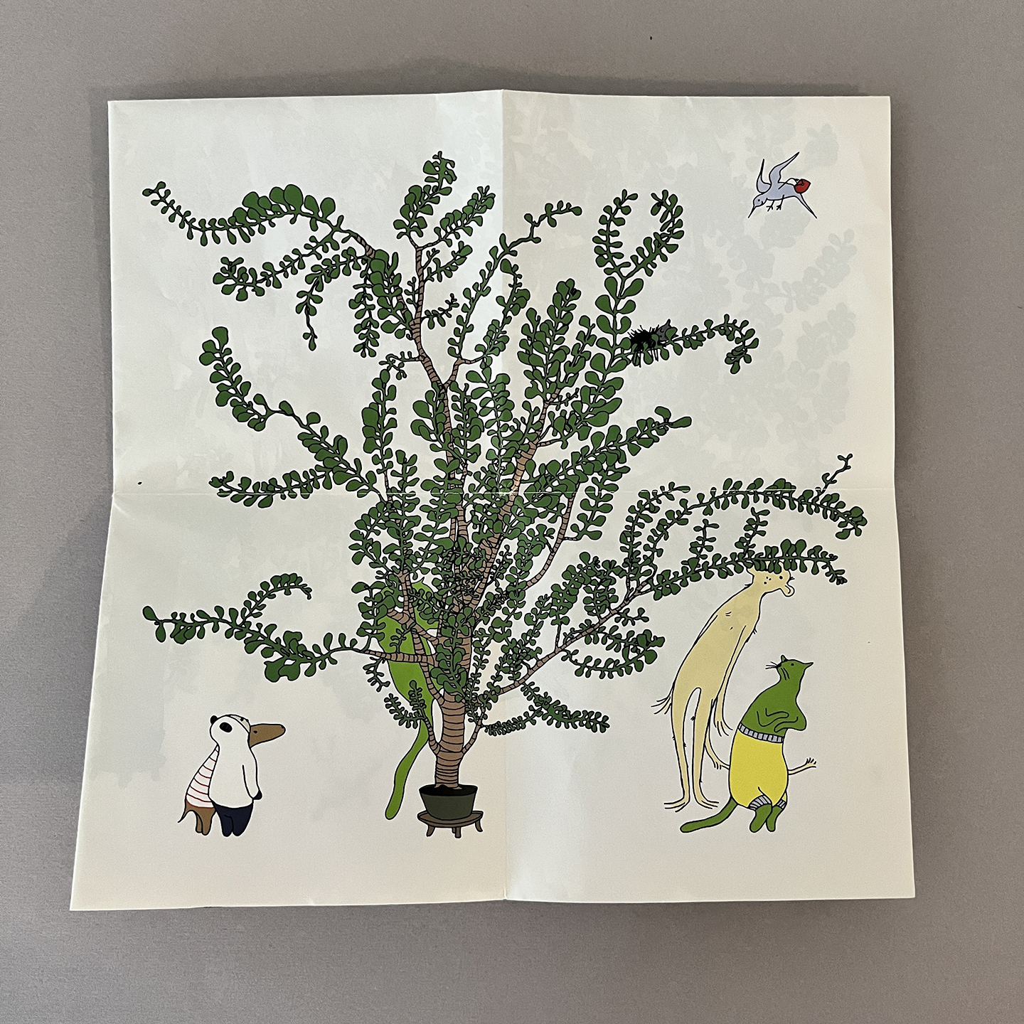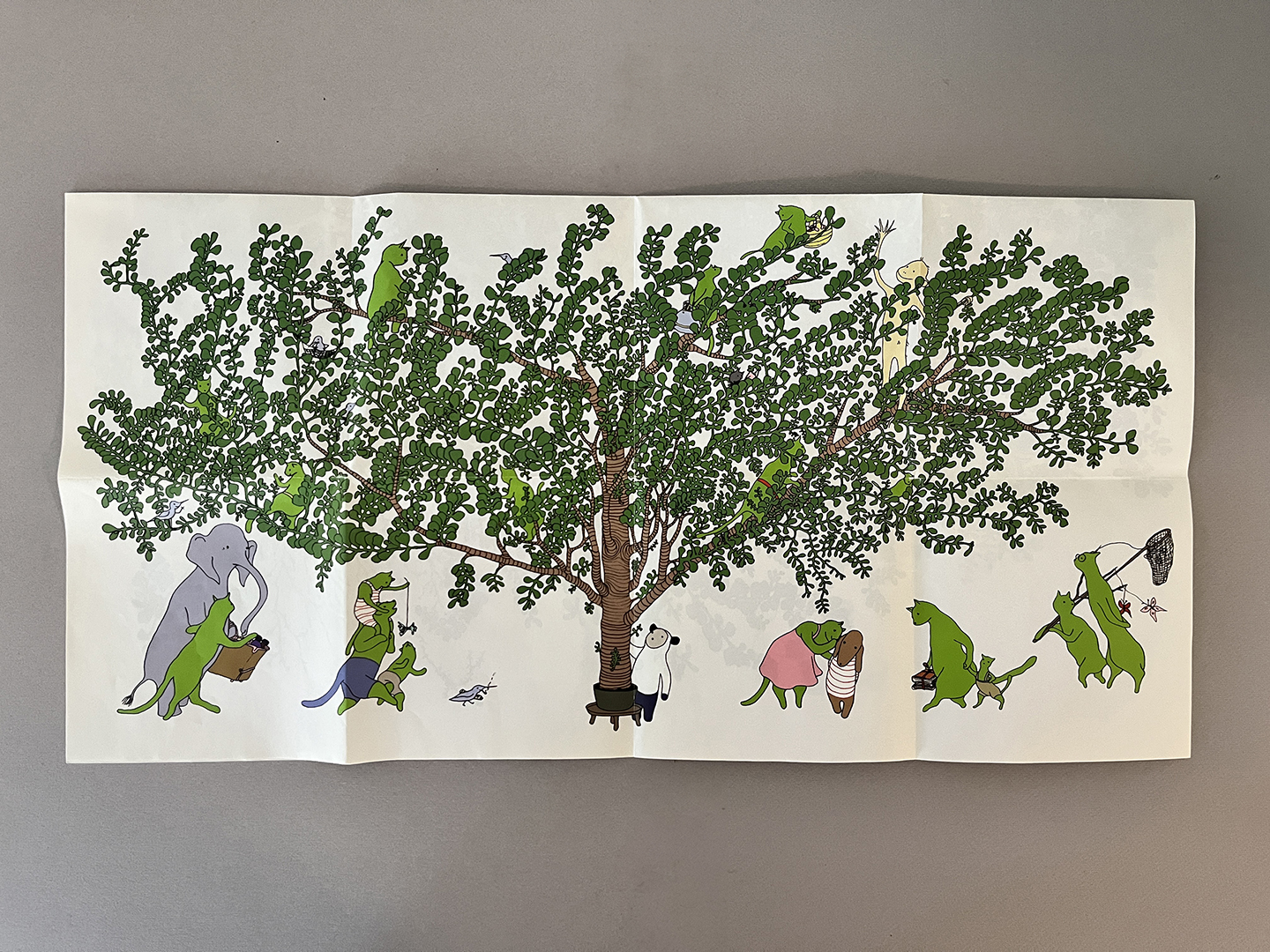 When unfolded it becomes one sheet of paper with a large tree picture on one side and another side has images of a tree growing with their original characters.