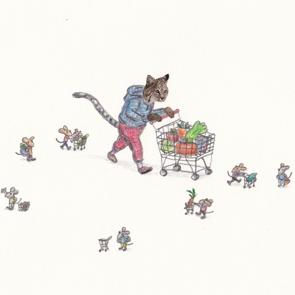 This is a high quality digital print of original artwork "Shopping Cart Cat" by artist Robbie Guertin.