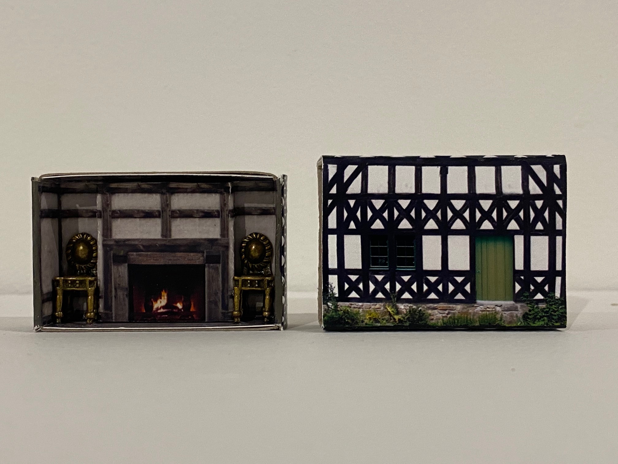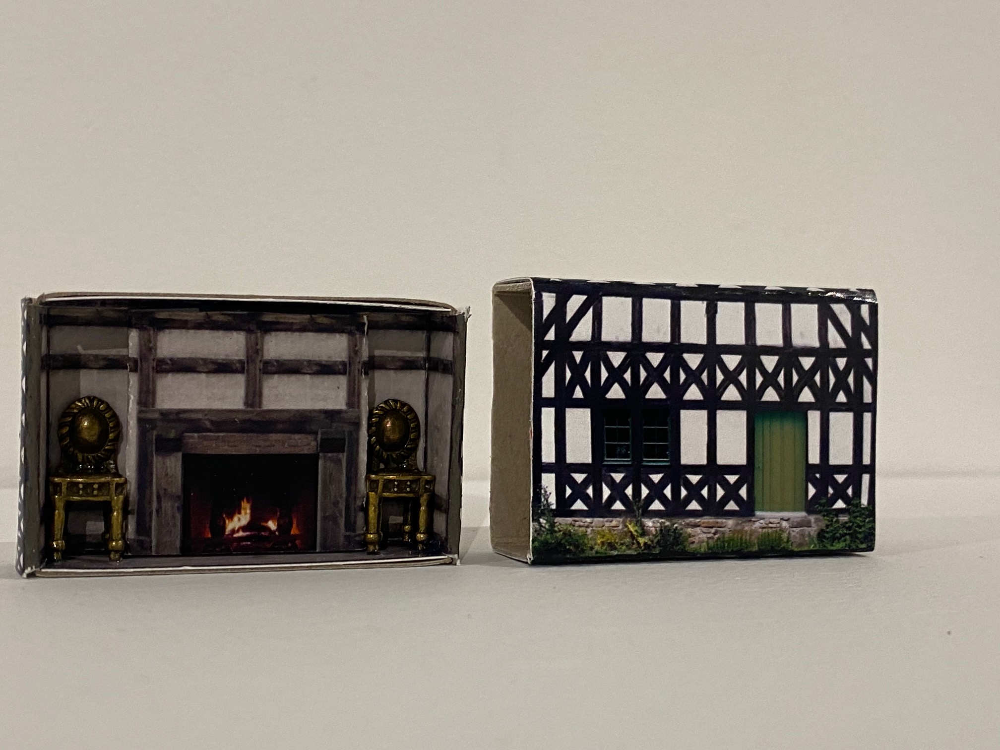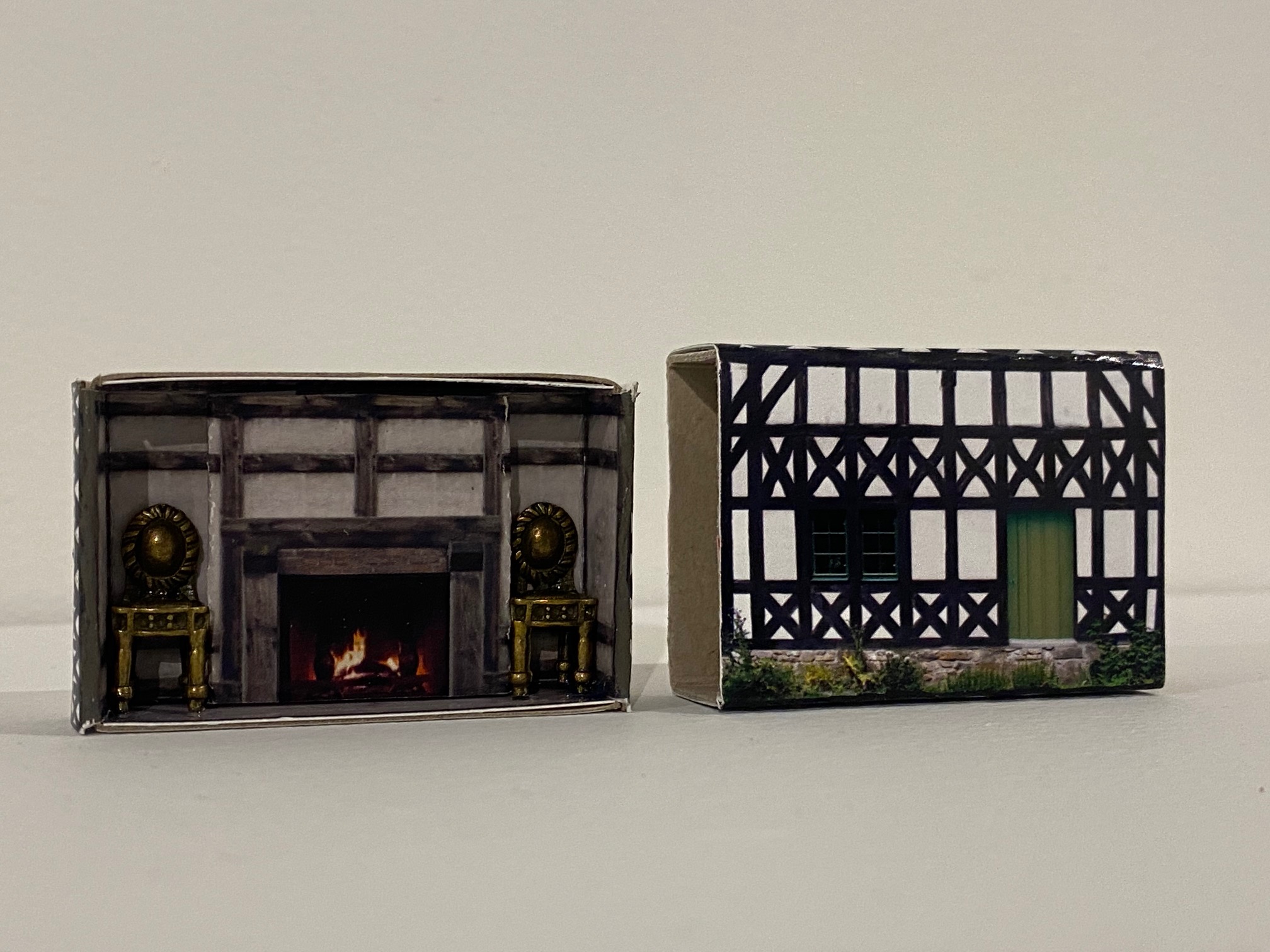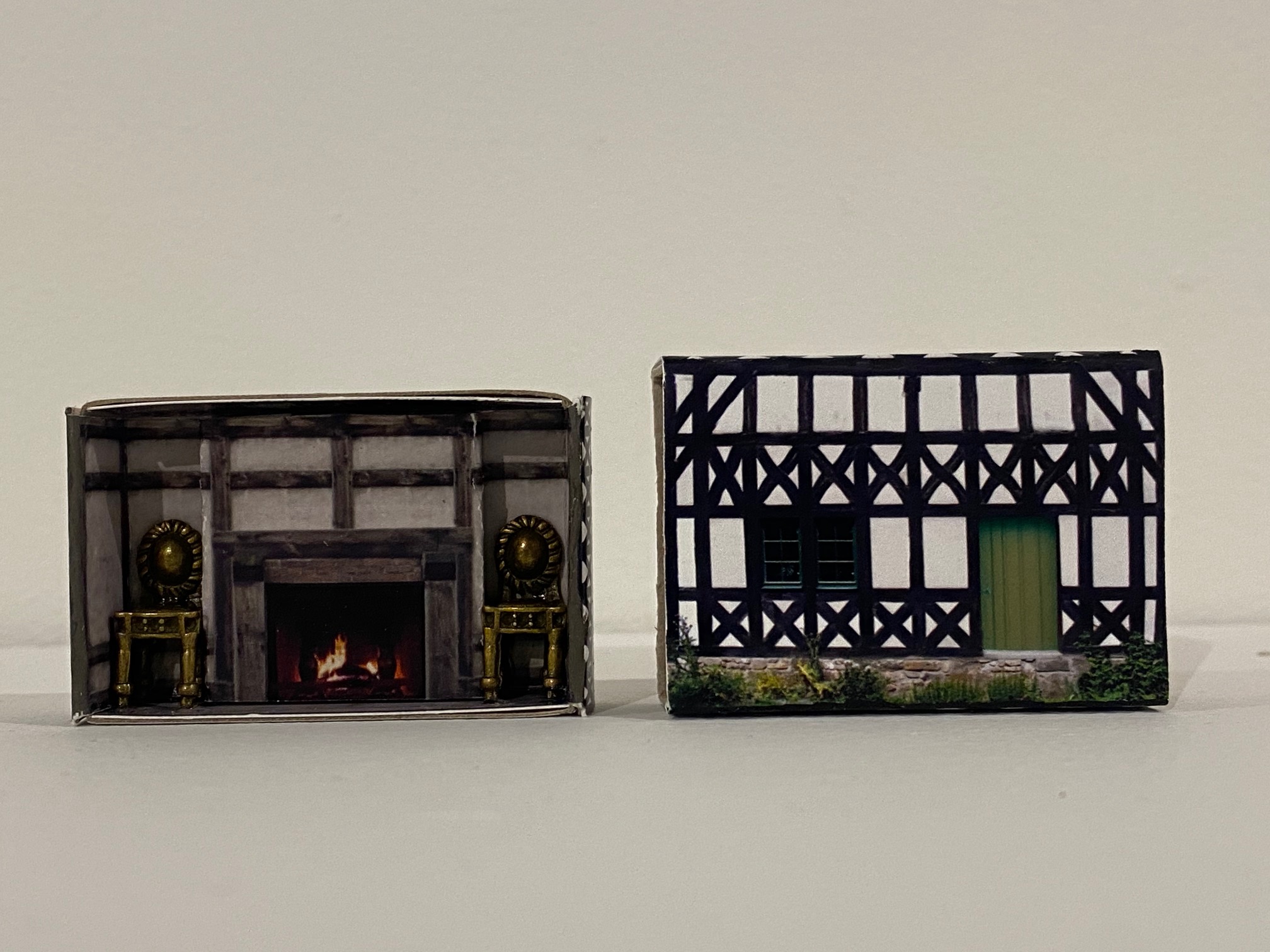 Artwork Title: Tudor Matchbox House Size: 2"x1 1/2" x 1/2" Materials: Paper, Card, Metal Chairs