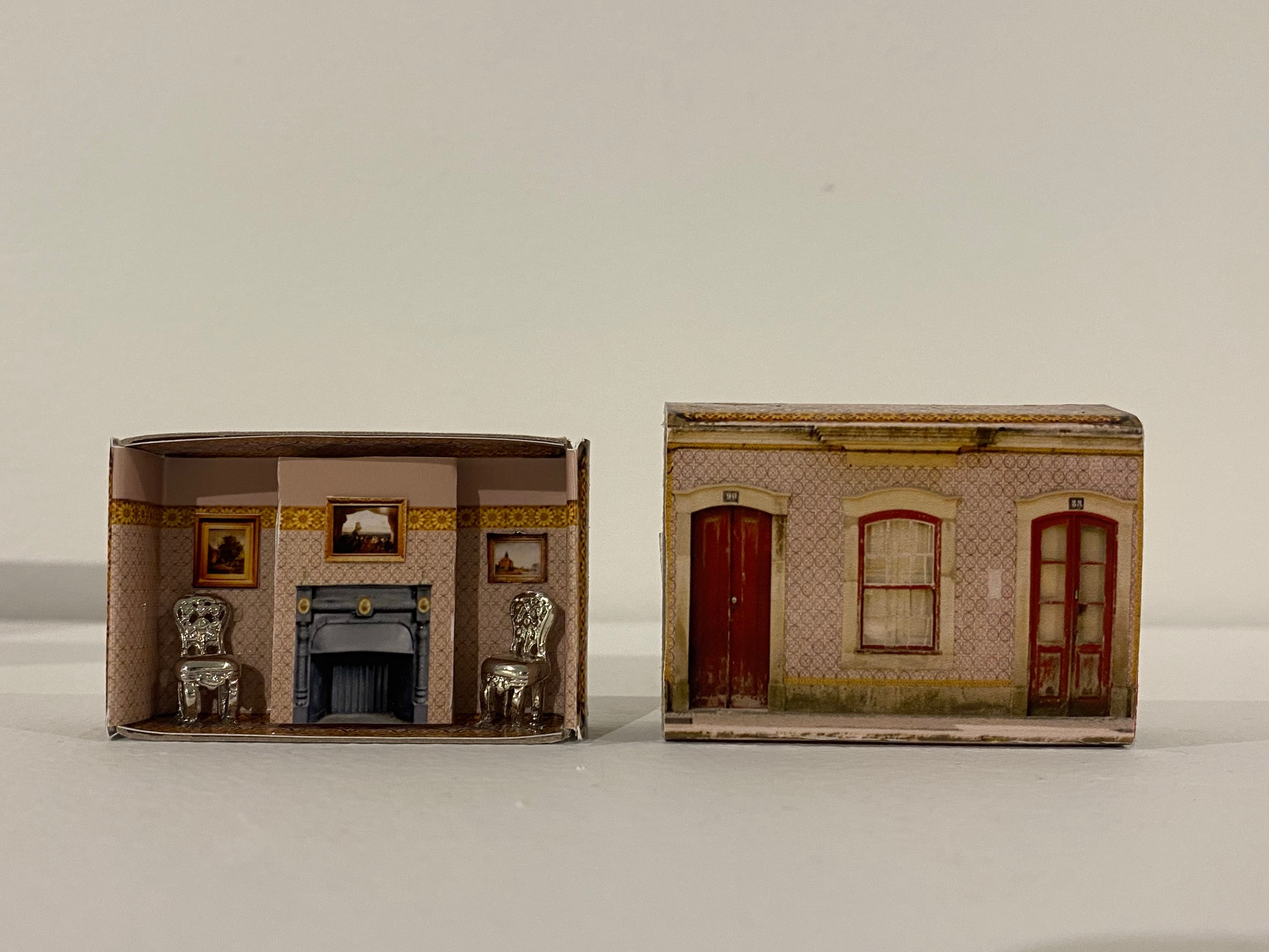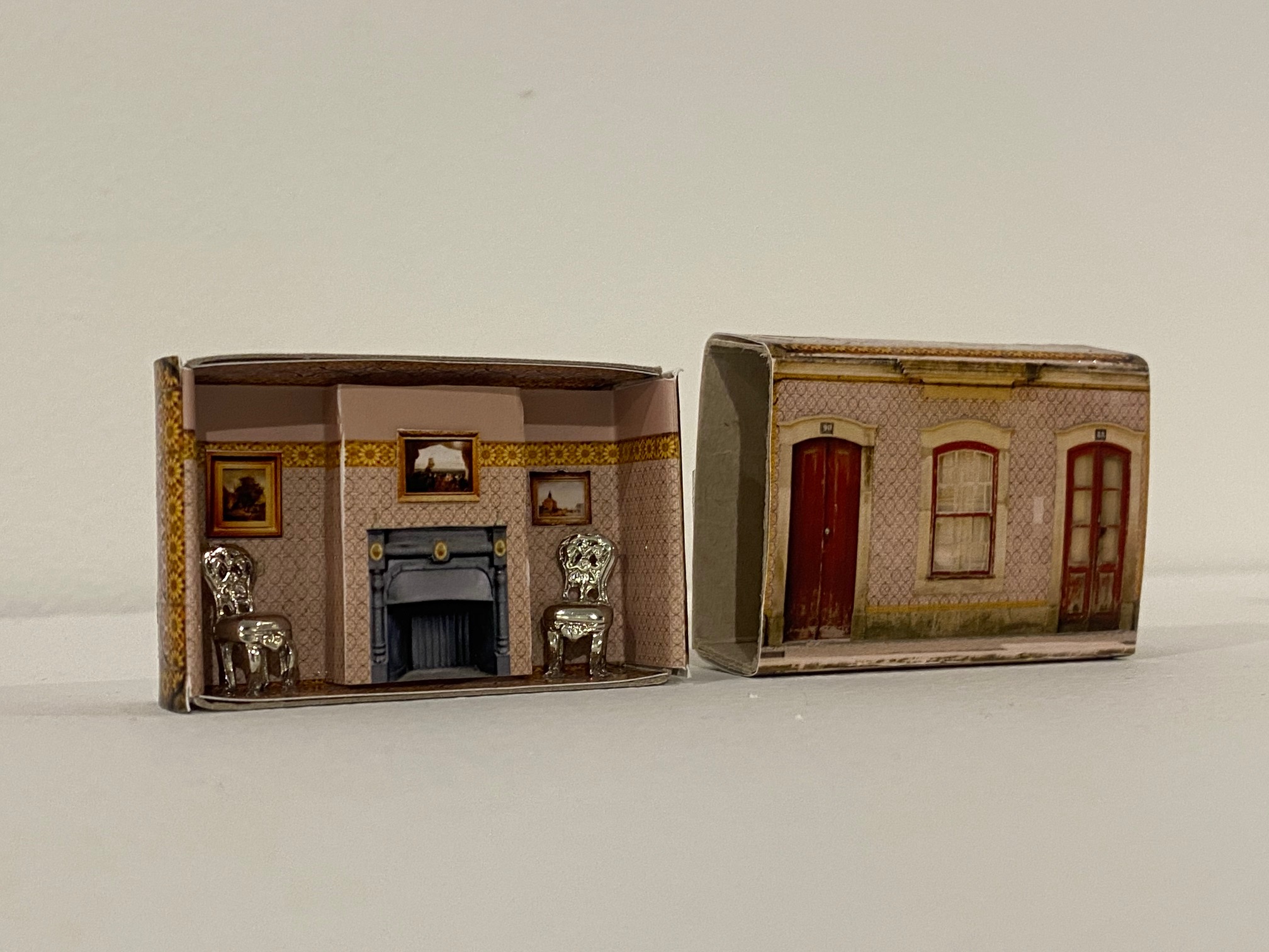 Artwork Title: Pink Matchbox House Size: 2"x1 1/2" x 1/2" Materials: Paper, Card, Metal Chair