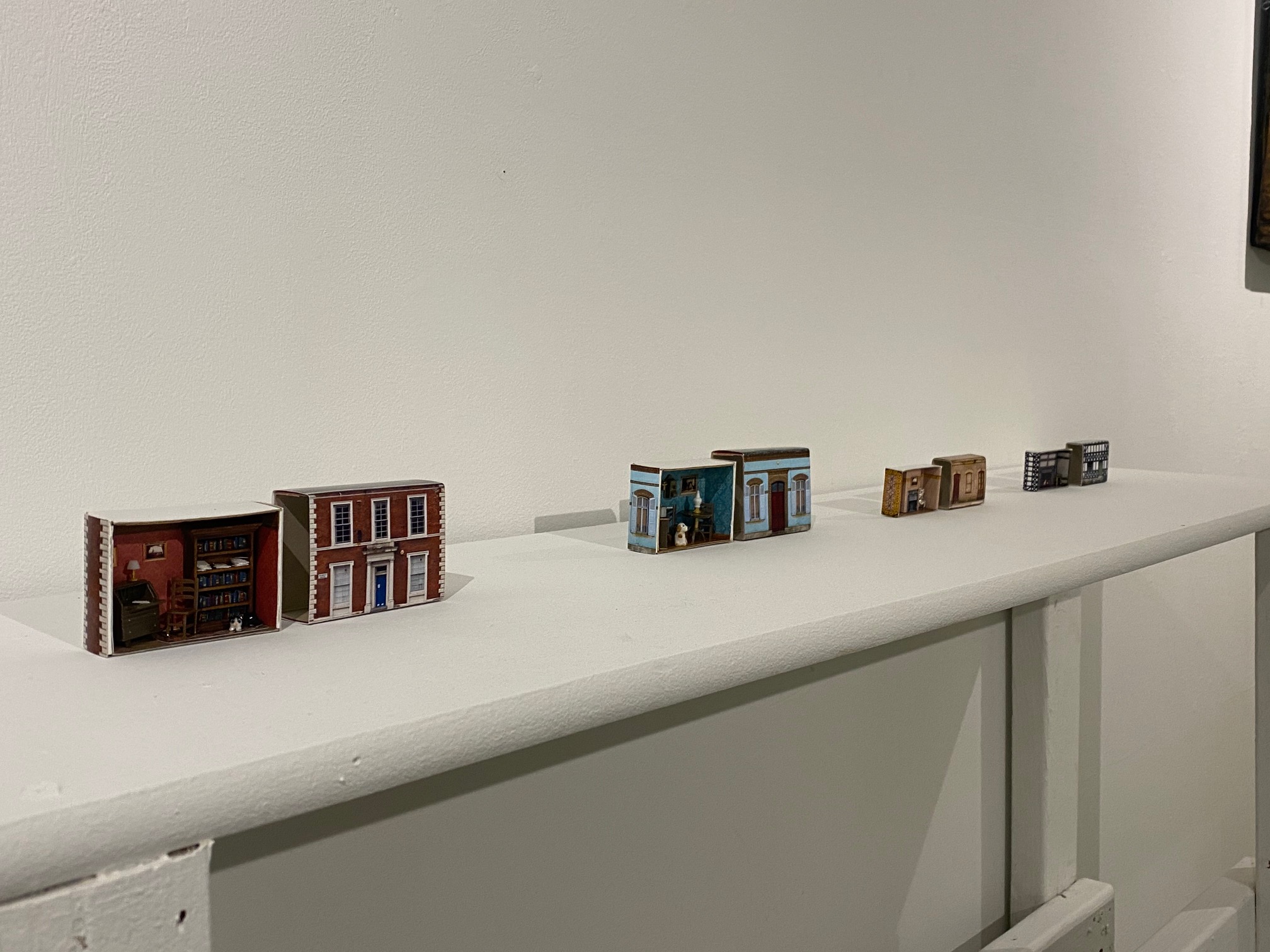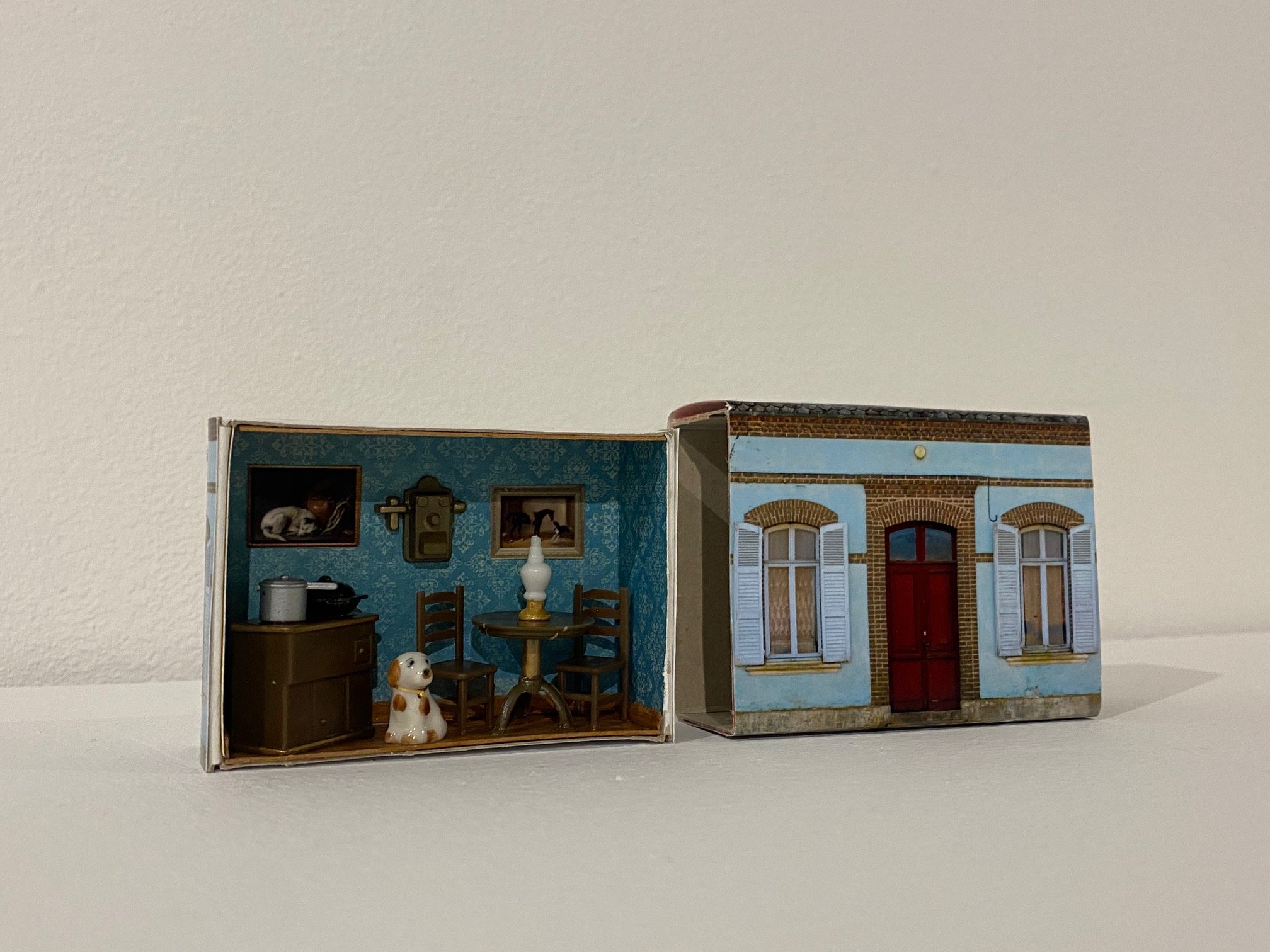 Artwork Title: Blue Lq Matchbox House Size: 2 3/4" x 2" x 1" Materials: Paper, Card, Metal Chair