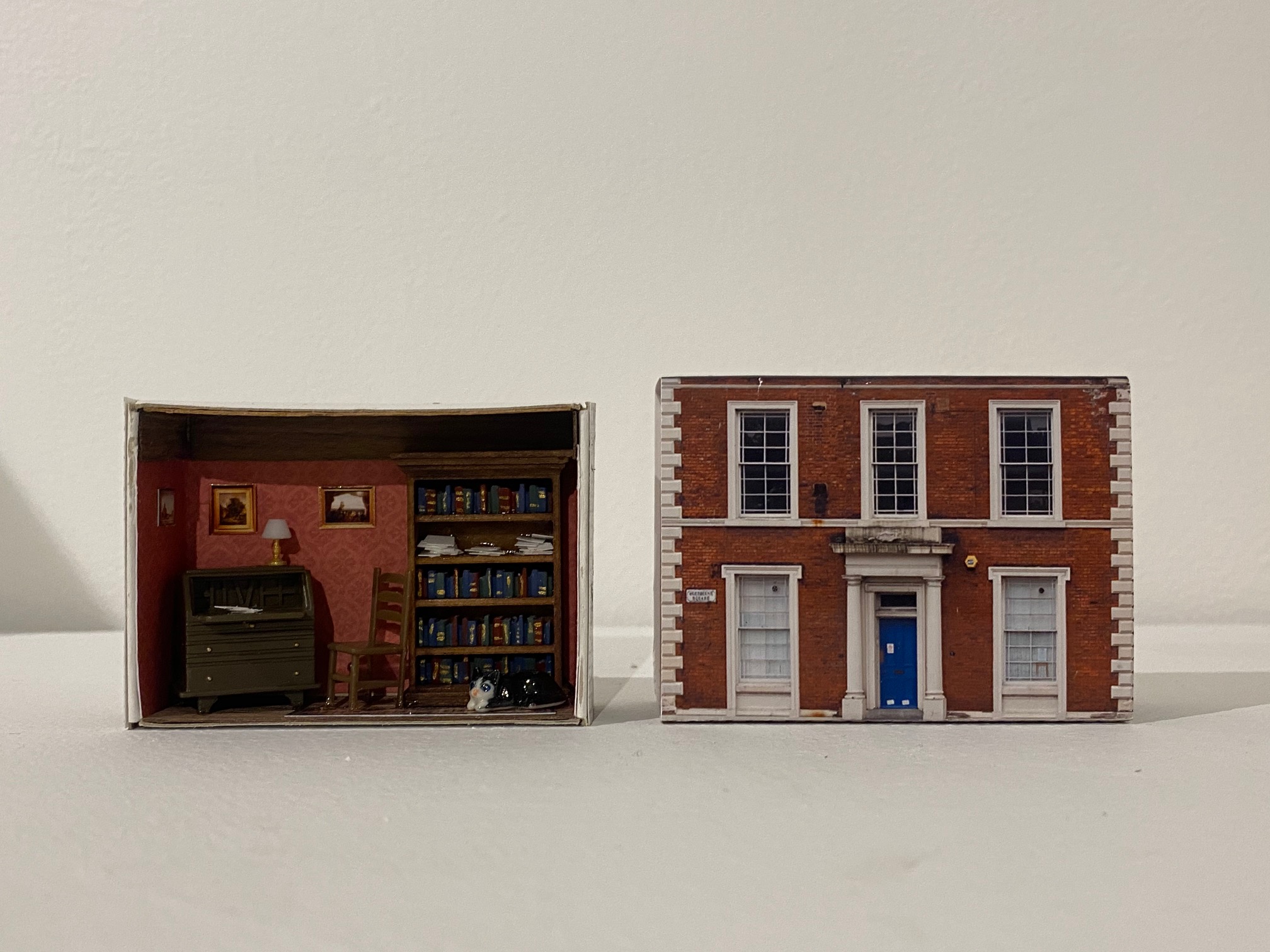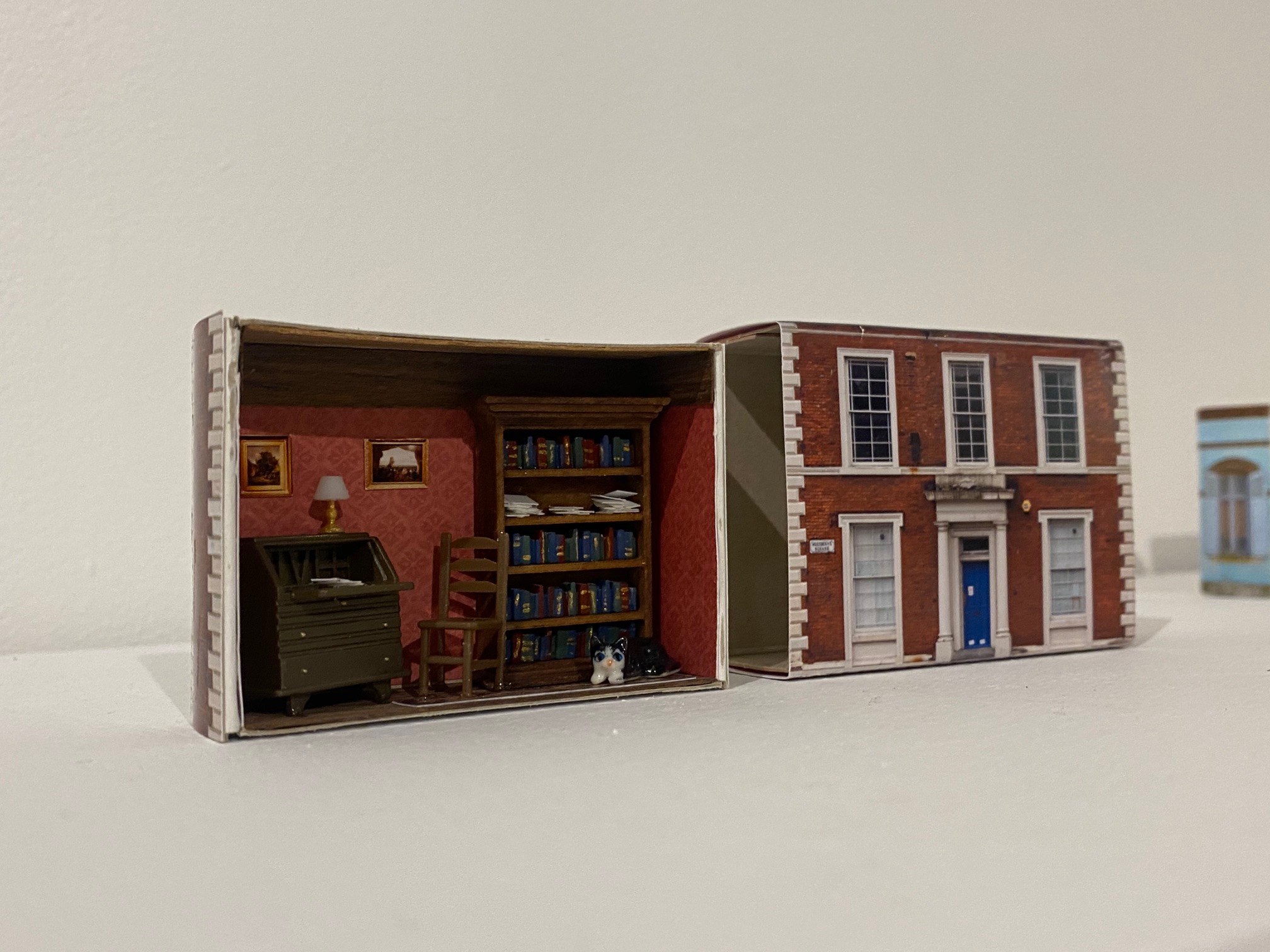 Artwork Title: Red Brick Matchbox House Size: 2 3/4" x 2" x 1" Materials: Paper, Card, Metal Chair