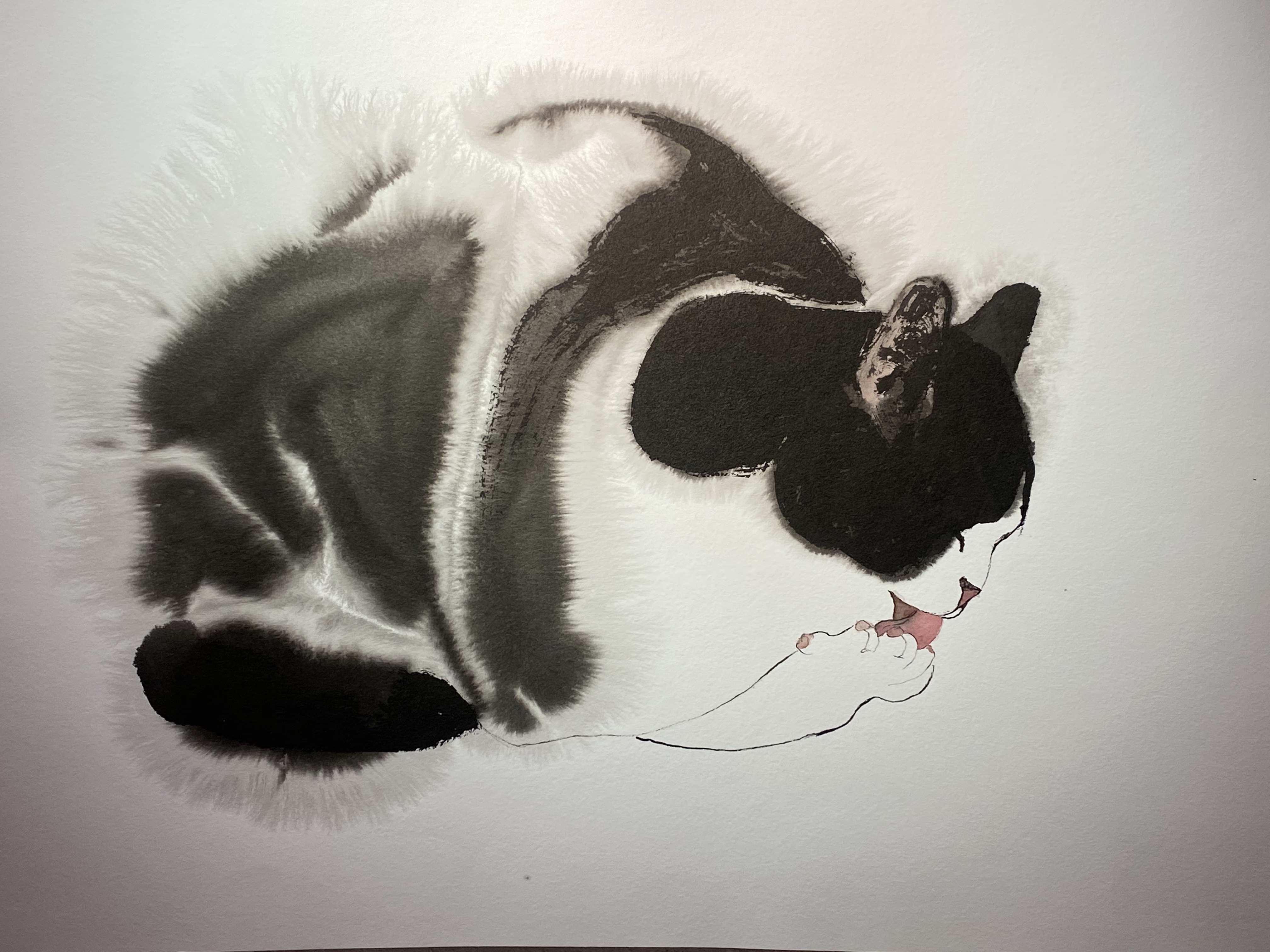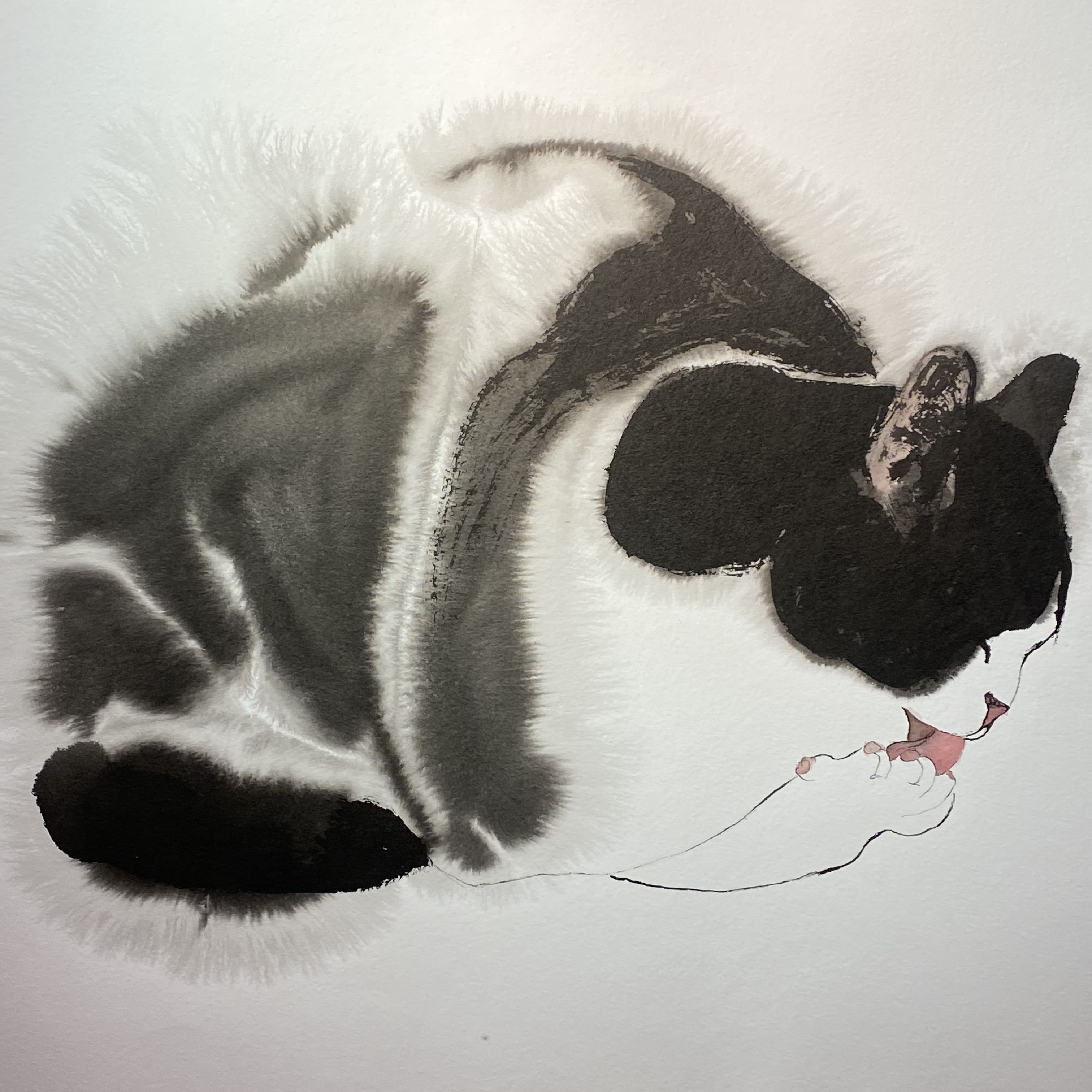"Grooming Black and White Cat" Ink Painting by Agnes Bodor